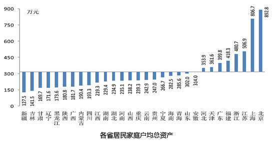 分经济区域看,东部地区明显高于其他地区,东北地区居民家庭户均总资产最低,仅占东部地区居民家庭的三分之一左右。分省份看,家庭资产最高的三个省(自治区、直辖市)为北京、上海和江苏,最低的三个省(自治区、直辖市)为新疆、吉林和甘肃。其中,北京居民家庭户均总资产约为新疆居民家庭的7倍。