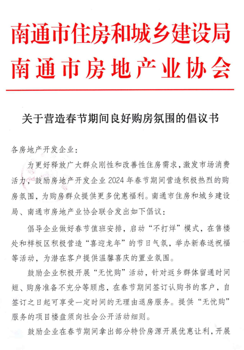 2月6日,南通市住房和城乡建设局、南通市房地产业协会联合发布《关于营造春节期间良好购房氛围的倡议书》。倡议书提出的“无忧购”尤为吸睛,目前已有不少楼盘积极响应,根据开发企业签署的承诺书显示在南通购买商品住宅可享受30天无理由退房!倡议书内容如下: